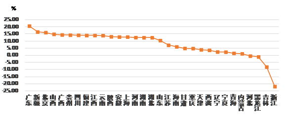 從各地區(qū)建筑業(yè)總產(chǎn)值增長(zhǎng)情況看,有 27 個(gè)地區(qū)的建筑業(yè)總產(chǎn)值較上年同期有不同幅度的增長(zhǎng)。其中,廣東、新疆、北京的增幅均超過 15%。有 4個(gè)地區(qū)出現(xiàn)負(fù)增長(zhǎng),其中,浙江出現(xiàn)了 超過20% 的負(fù)增長(zhǎng)(圖 2)。